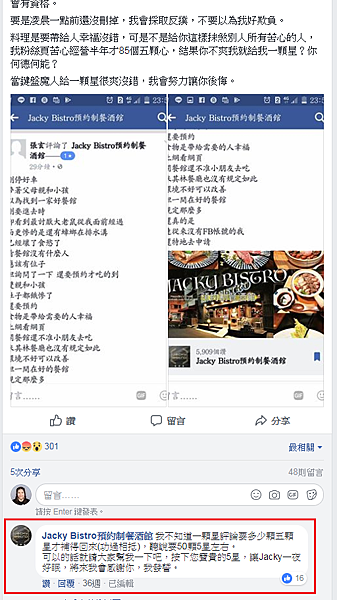 礙於Facebook評論無法貼網址所以用這篇文章Jacky Bistro預約制餐酒館 老闆您一直再說謊欺騙讀者粉絲嗎??來說明我的問題跟提出印證,不要在說我抹黑老闆你了